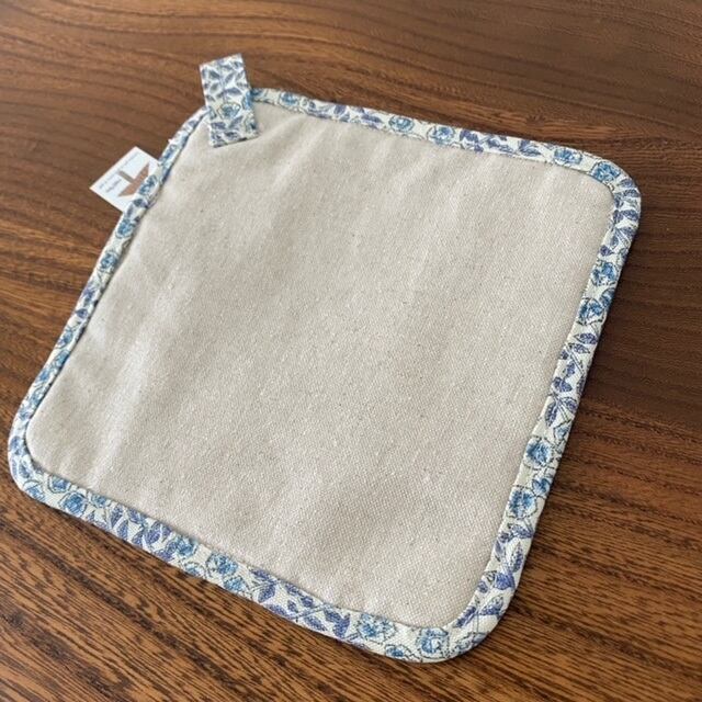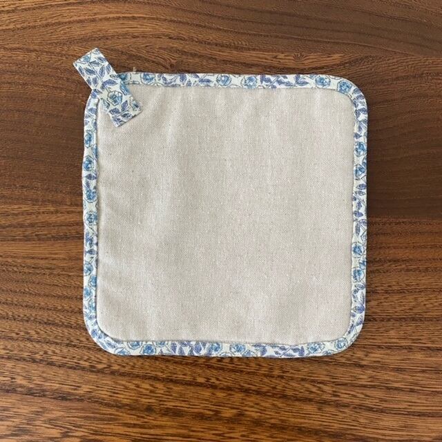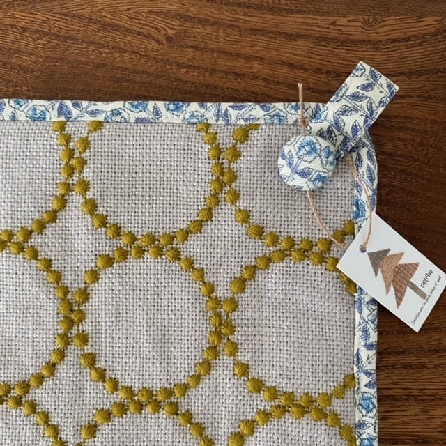 ミナペルホネンtambourine/タンバリン(ベージュ色にマスタード色の刺繍)の生地とsleeping roseのオックス生地で作ったポットマットです。