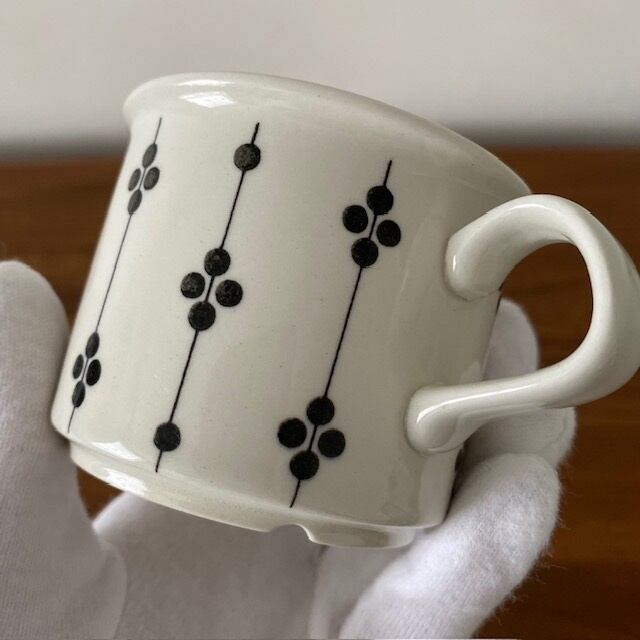 ファエンツァなどにも使われたベーシックフォルムに、黒い線・ドット・薄いブラウンのラインを描いたシンプルなデザインで、ドットを4つ並べた絵柄は木の実を連想させます。