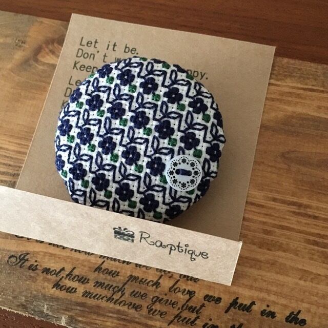 生成りの生地に紺小花と緑色の実を連続刺繍。
