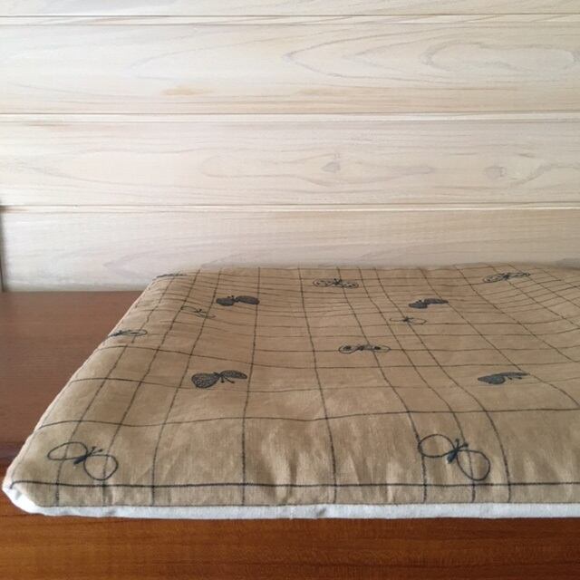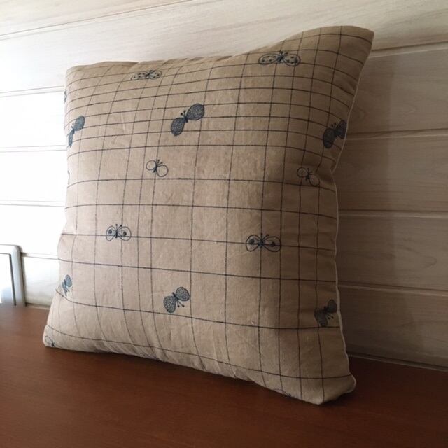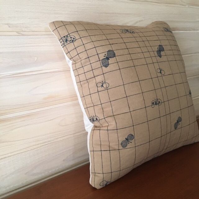 ミナペルホネンchoucho/ちょうちょ(薄い茶・ちょうちょ刺繍は深い緑色)の生地で作ったクッションカバーです。