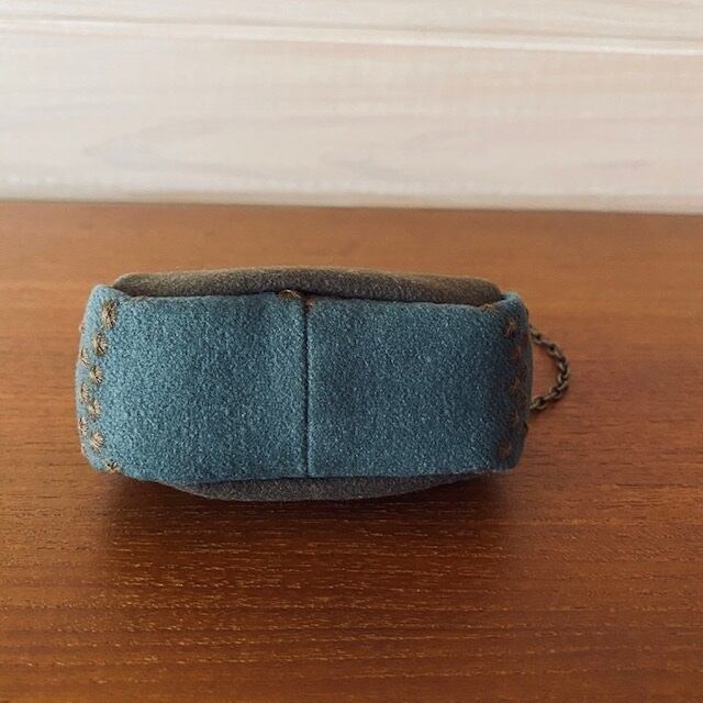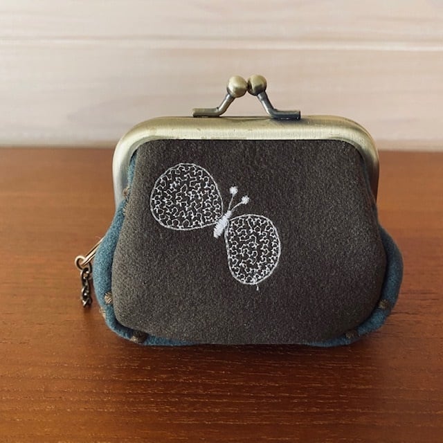 ミナペルホネンchoucho/ちょうちょとtambourine/タンバリンのdop生地で作ったガマ口バックチャームです。dop生地は両面モールスキンのダブルフェイスによる生地です。(表面はフェルトのような質感、リバーシブル可能生地)