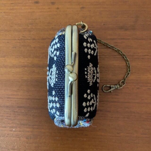 ブラック生地にベージュの糸で手刺繍したガマ口バックチャームです。