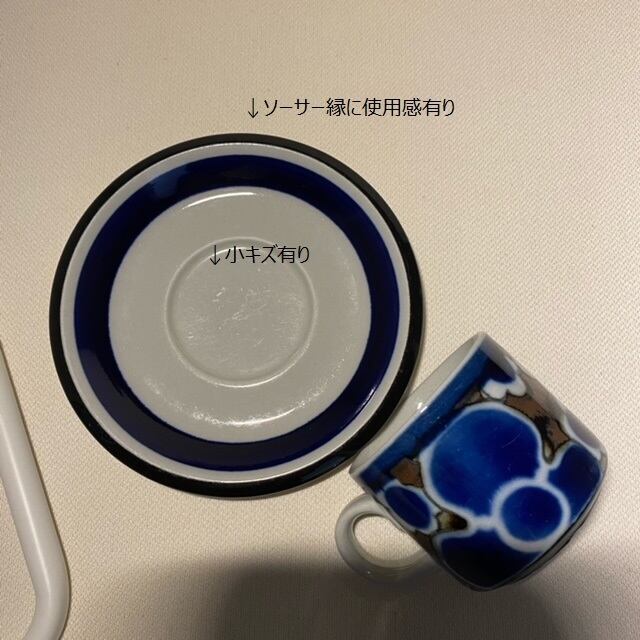 コンディション: カップ・ソーサーの表面とフチに細かい傷があります。カップ持ち手に薄くペイント付着、表底の黒い部分に白いペイント付着が数か所あります。ヒビ・欠けなく良好なヴィンテージコンディションですが以上を考慮した価格となっております。