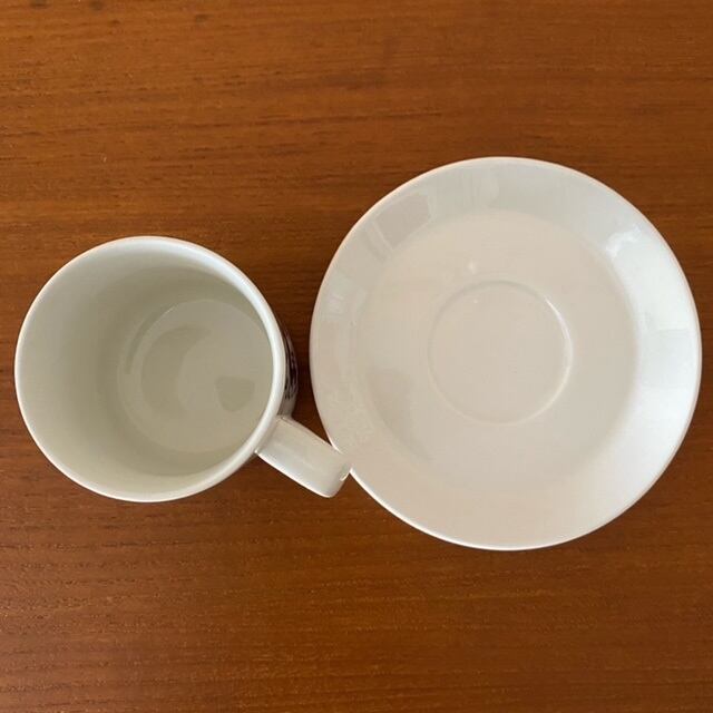 コンディション: カップ持ち手に微細な黒点がありますが、小傷は少なく艶があり、良好なヴィンテージコンディションです。このシリーズは、ソーサーのフチに焼成時の支柱痕が発生します。