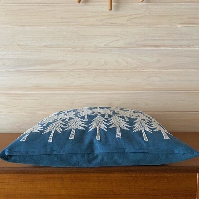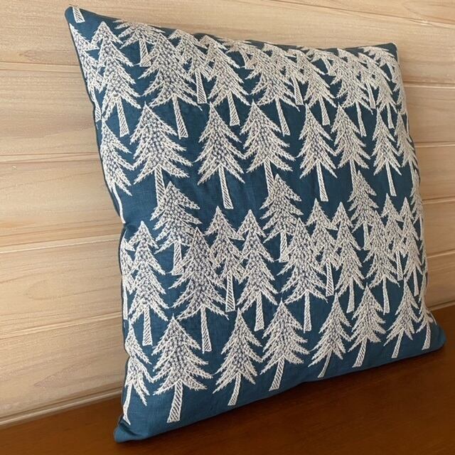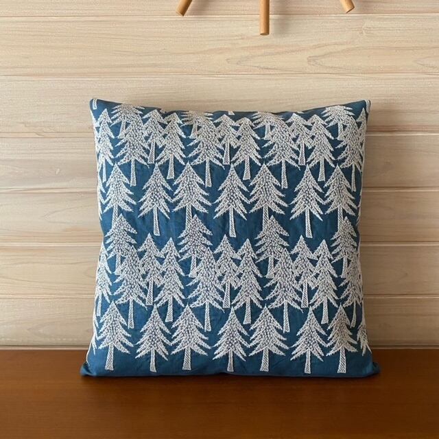 ミナペルホネンland theater/ランドシアター(グリーンがかったブルー色にオフホワイト色の刺繍)の生地で作ったクッションカバーです。