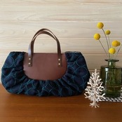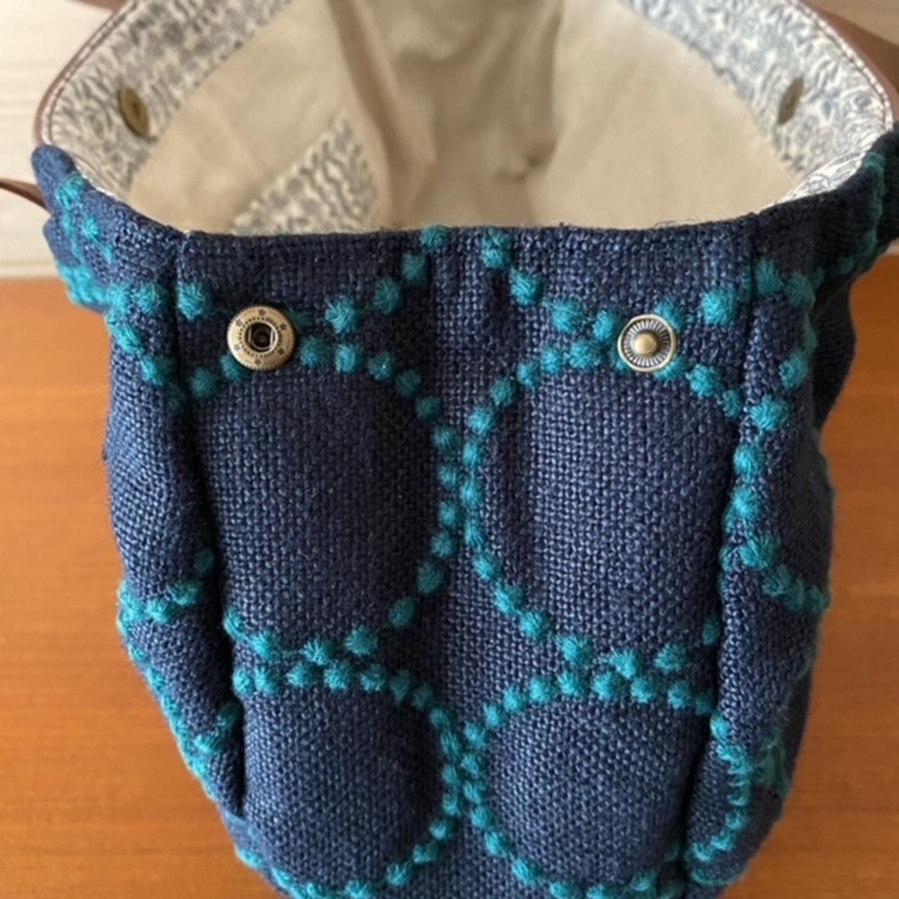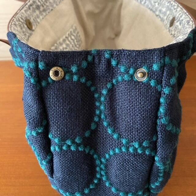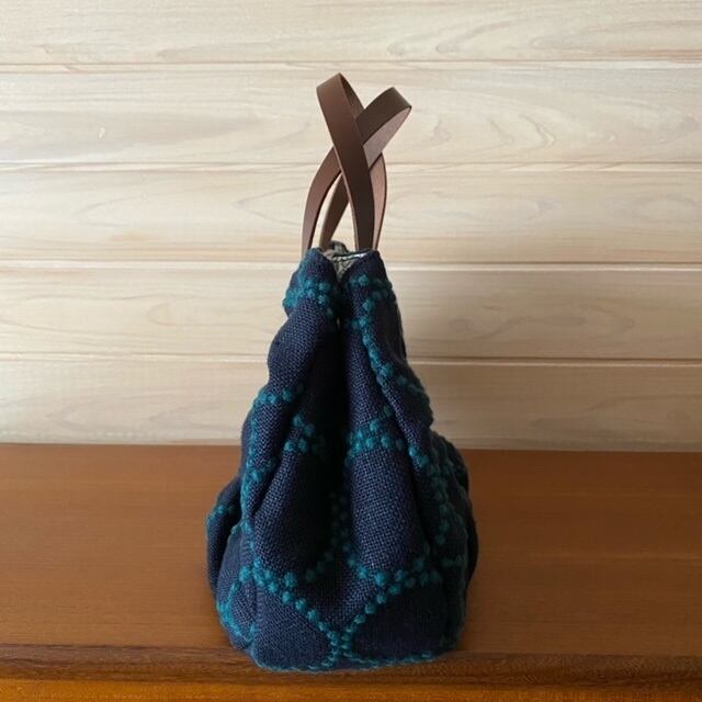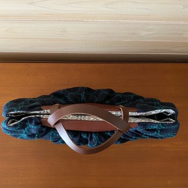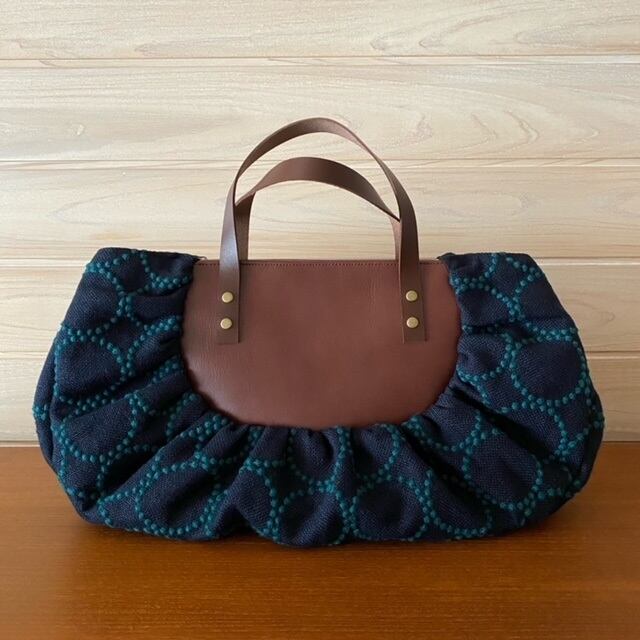 tambourine navy+green生地と本革ブラウンを使用した、ふんわりギャザーが可愛い2wayバックを製作しました。