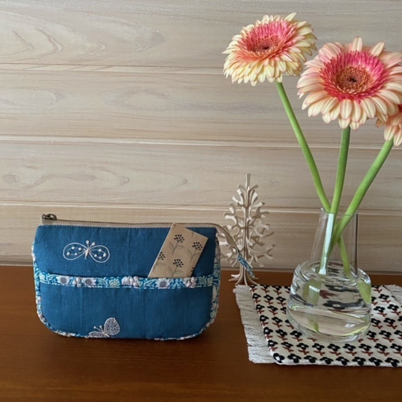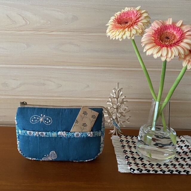 伊勢丹限定販売のstrawberry thief+tambourine生地とchoucho生地で製作したポーチです。