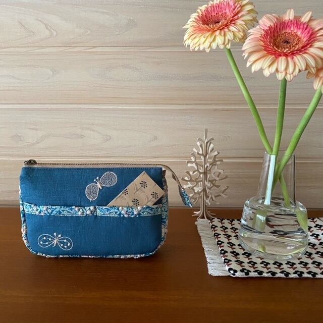 伊勢丹限定販売のstrawberry thief+tambourine生地とchoucho生地で製作したポーチです。