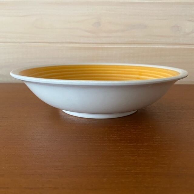 黒一色の幾何学的な模様に明るいオレンジイエローの縁取りがとても可愛らしいボウルです。