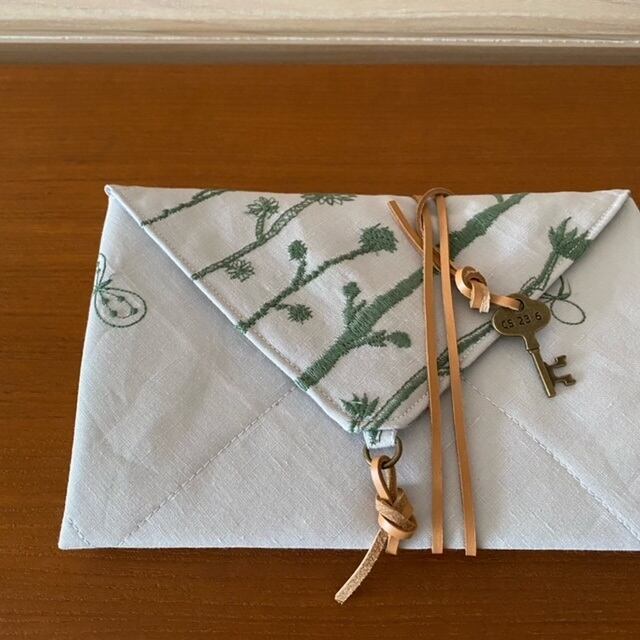 ミナペルホネンchoucho+noppara(ライトグレー色にモスグリーン色の刺繍)の生地で作った保温・保冷シート付ふろしきです。