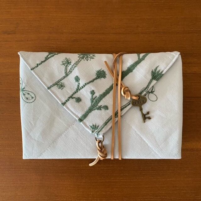 (外布)表面/ミナペルホネン choucho+noppara(ライトグレー色にモスグリーン色の刺繍),裏面/保温・保冷シート(弱水洗いOK、乾燥機不可)