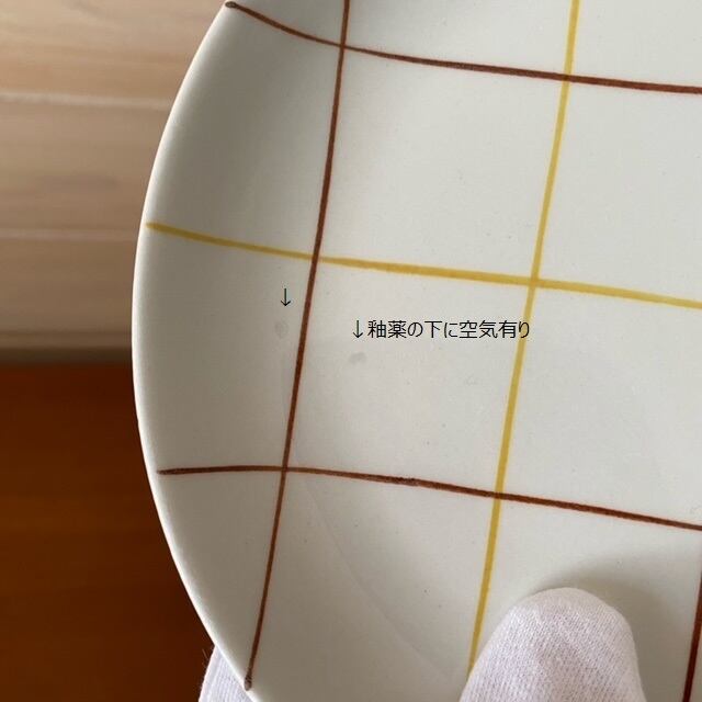 表面に釉薬を塗る際に入ったと思われる浅い空洞があり、裏面にライン状の釉薬のムラがあります。表面には全体的に小傷が多数あり、裏面の高台まわりも擦れと小傷があります。全体的な小傷の量と使用感を考慮した価格となっております。