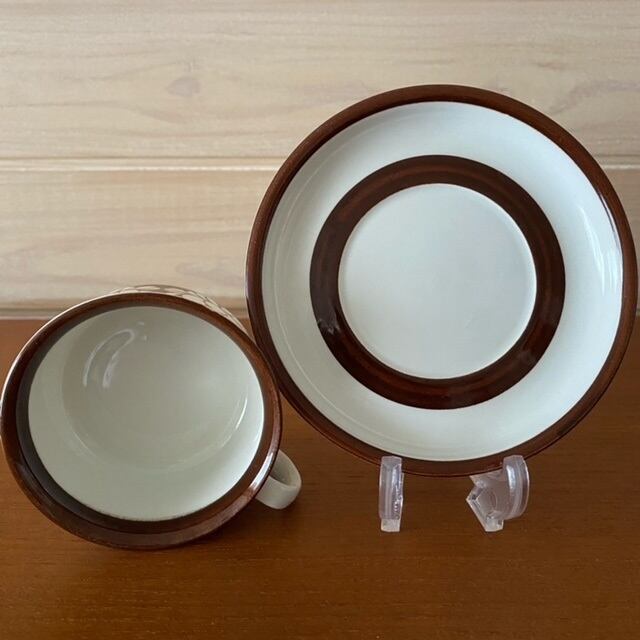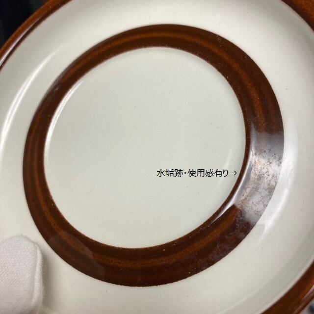 コンディション:カップ側面高台付け根部分の釉薬にムラがあり、カップ持ち手に薄い黒点があります。プレート表面に水垢跡と使用感があり、カップ裏面底付近に光にかざすとわかる水垢跡があります。艶があり、ひび・欠けない良いヴィンテージコンディションです。