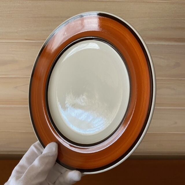 表面の白い部分に製造時に出来たと思われる薄い曲線が釉薬下に見えます。また裏面支柱跡に黄ばみがあり表面に若干の小傷がありますが、艶がありヒビ・欠け無い良いヴィンテージコンディションです。