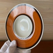 カップの外側縁に薄い茶点、カップ側面持ち手付近に黒点、裏面高台に汚れと小さい削れがあります。ソーサーの表面ブラウン部分に黒点があり、ソーサー裏面に少し大き目の支柱跡があります。カップ・ソーサーの小傷は少量で艶があり、ヒビ・欠け無い良好なヴィンテージコンディションです。