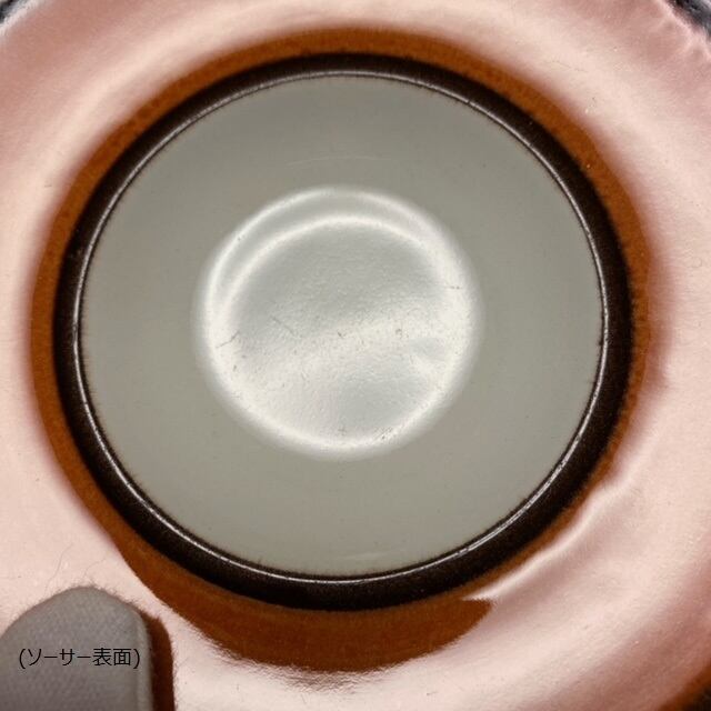 カップ内側に極小の薄い茶点が数か所あり、カップの側面こげ茶ラインの色ムラがあります。ソーサー表面に光にかざすとわかる程度の極小の突起があり、ソーサー裏面に大きめの支柱跡・高台に汚れと黒点があります。刻印付近の釉薬下の薄いラインは亀裂ではございません。カップ・ソーサーの小傷は少量で艶があり、ヒビ・欠け無い良好なヴィンテージコンディションです。