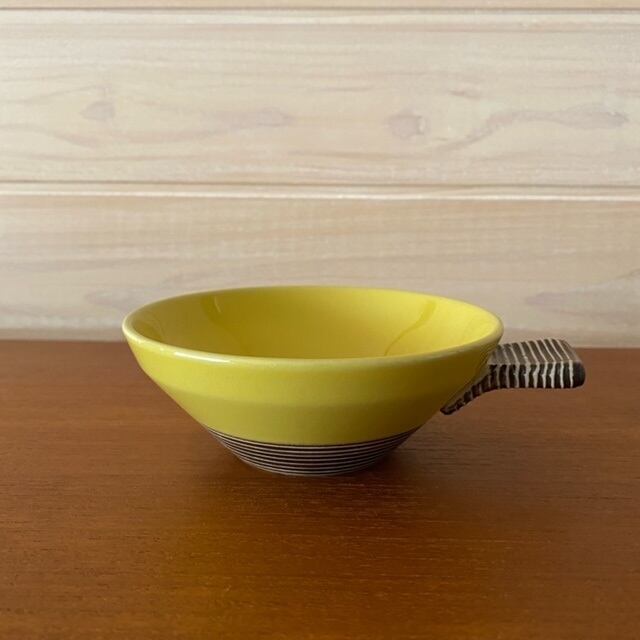Carl-Harry Stalhaneがデザインを手がけた作品で、発色の綺麗な黄色にかわいらしい縞々の取手が絶妙のアクセントになっております。