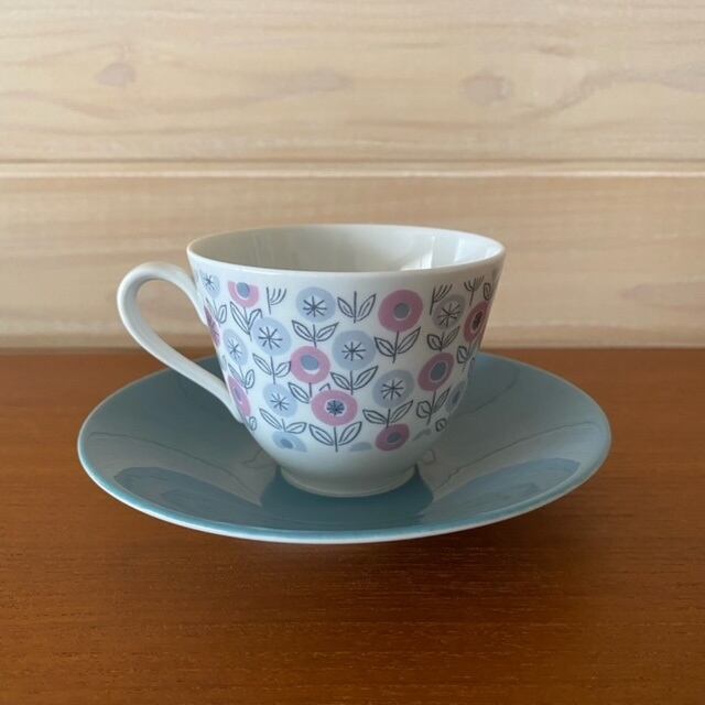 淡いピンク色と薄いグレイ色の丸い花がデザインされた優しい雰囲気のカップに、ブルーグレイ色のソーサーが美しいカップ&ソーサーです。