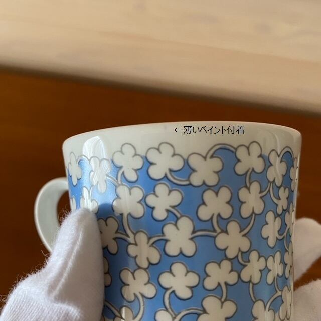 カップ持ち手付近に突起・素地のしわがあり、カップ側面縁に薄いペイントの付着、カップ側面高台付近に小さい突起があります。またソーサー表面に小さい突起と裏面に釉薬のムラがあります。表裏ともの若干の小傷はありますが、艶があり綺麗で、欠け・ヒビ・貫入もない良好なヴィンテージコンディションです。