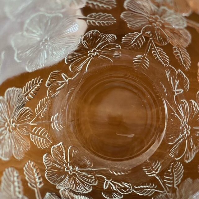 しっかりとした厚めのグラスで、外側に施された花模様は奥行きがあり立体的なデザイン。