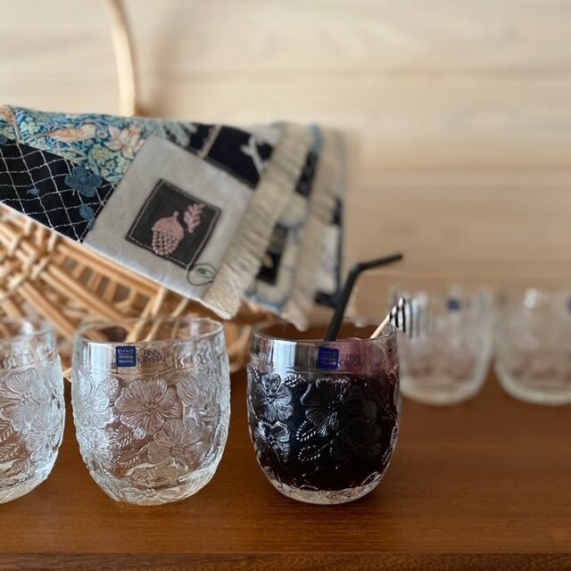 しっかりとした厚めのグラスで、外側に施された花模様は奥行きがあり立体的なデザイン。