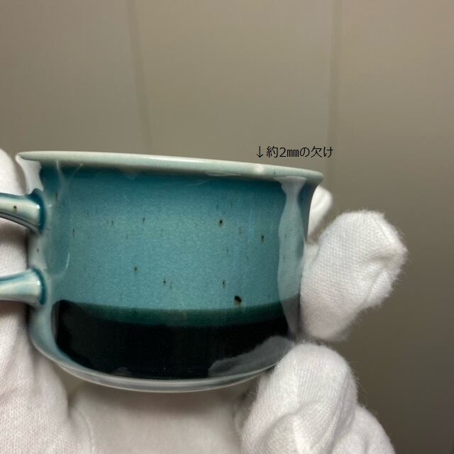 コンディション:カップの縁に約2㎜の欠けがあり、側面黒いペイント部分に白いキズがあります。ソーサーの表面に点状の突起・凹み数か所・ソーサー裏面にも突起数か所があり、ソーサー表面は全体的に小傷・擦れが多いです。ソーサーは素地の粗さが目立ち、そのためか小傷も多い印象です。カップの約2㎜の欠けを考慮した価格となっております。