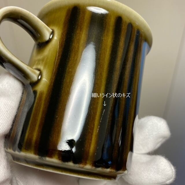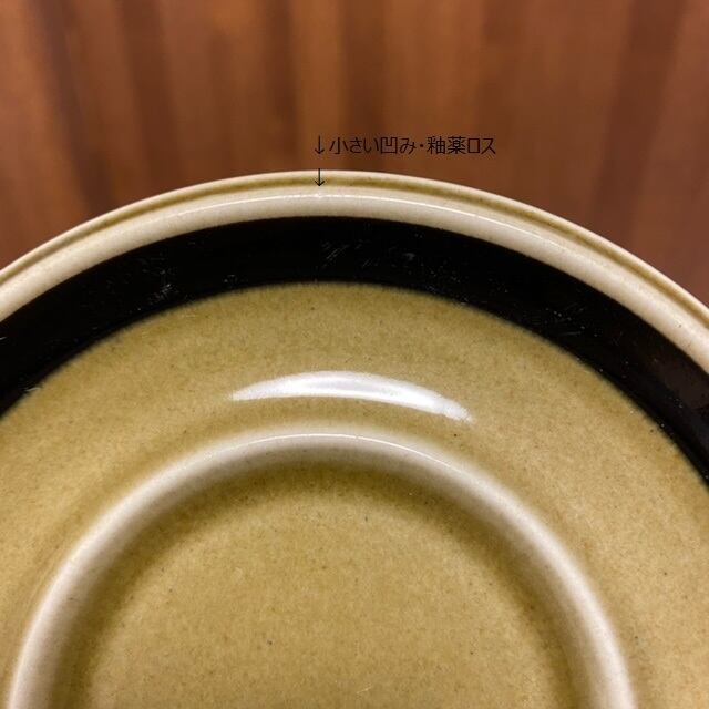カップ側面に細いライン状のキズがあり、ソーサー表面縁に若干の小傷・小さい凹みと釉薬ロスがあります。裏面高台に浅い凹みがありますが、艶があり、欠け・ヒビ・貫入もない良好なヴィンテージコンディションです。
