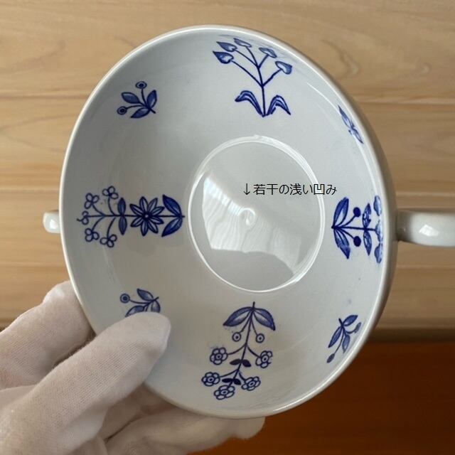 内側にペイントロス・色とび、外側に薄いペイントの付着がございますが、こちらのシリーズの製造過程によくみられるもので、不良品ではございません。また内側底に浅い凹み・裏底高台に小さい凹みがあり、ハンドペイントならではですが、絵柄の配置に若干のずれがあります。