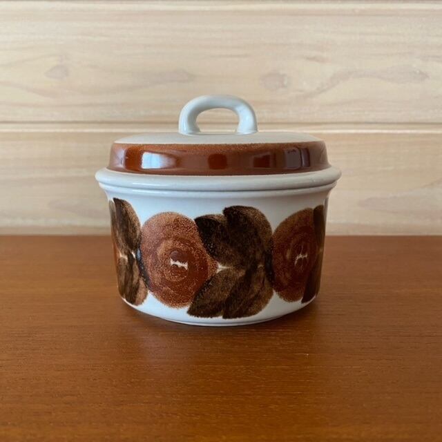 コンディション: 本体裏面高台に浅い凹みと、蓋の表側面に製造時に出来た点状のペイント・釉薬ロスがあります。小傷は大変少なく絵付もきれいで艶があり、ヒビ・欠けなく良好なヴィンテージコンディションです。