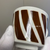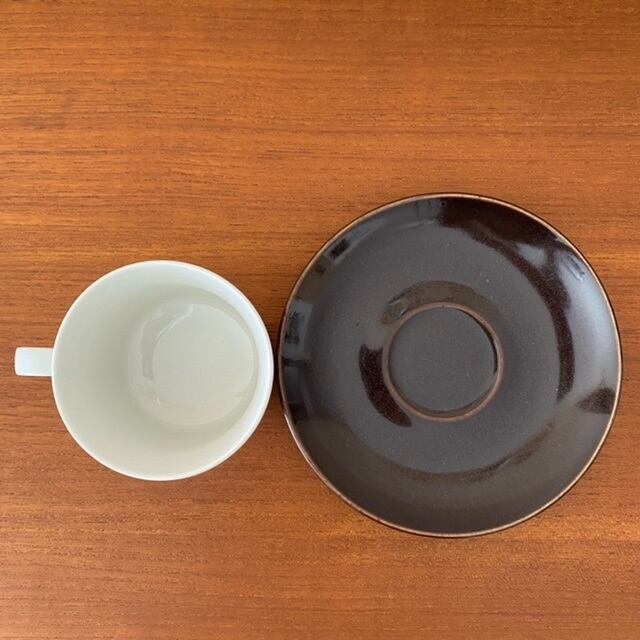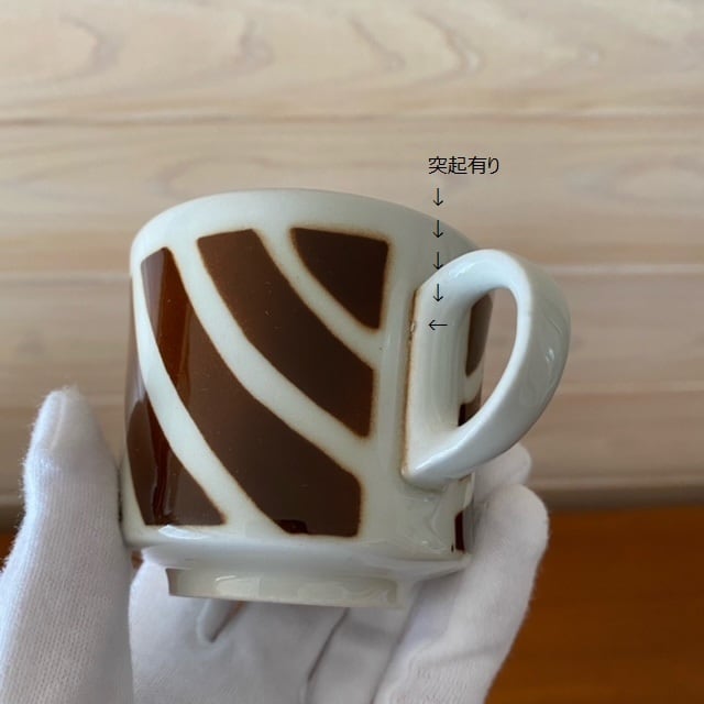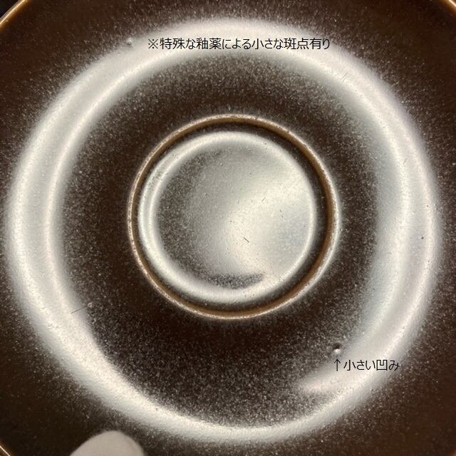 コンディション:カップの持ち手付近に小さい突起・カップ側面下部にペイントとび・カップ側面に薄い小傷があります。ソーサーは表裏に小さい凹みが数か所・裏面高台付近に釉薬の削れがあり、ソーサー全面に使用された特殊な釉薬による斑点があります。小傷は少なくヒビ・欠けない良好なコンディションです。