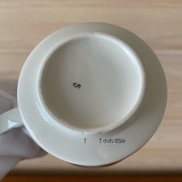 コンディション:カップの持ち手付け根付近に釉薬下の凹み・カップ裏面高台に小さい凹みがあります。ソーサーは裏面に小さい凹みが数か所・裏面高台付近に釉薬の削れ・高台に凹みがあり、ソーサー全面に使用された特殊な釉薬による斑点があります。小傷は少なくヒビ・欠けない良好なコンディションです。