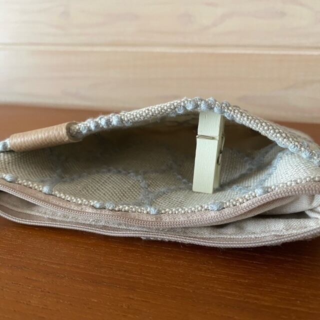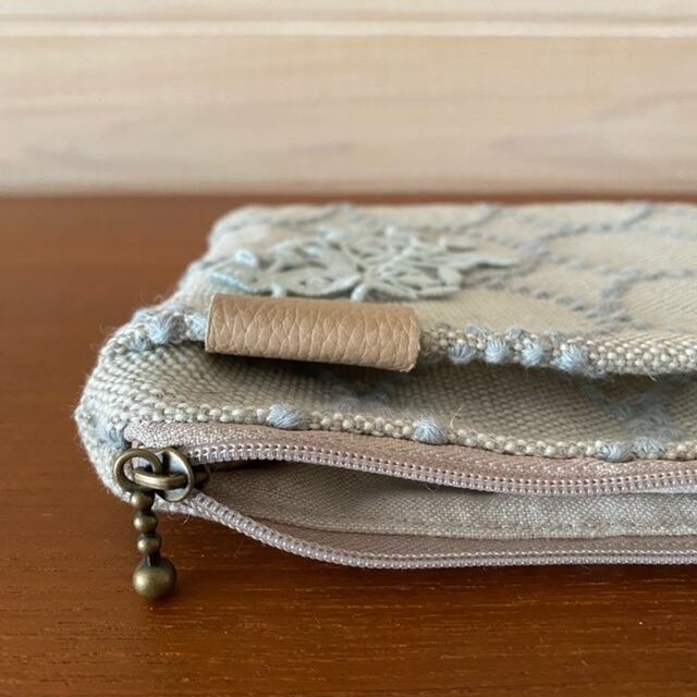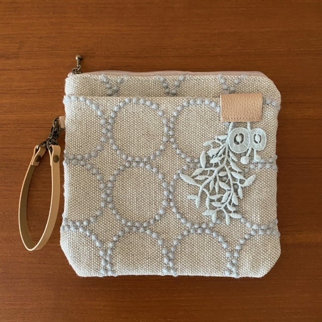 tambourine/タンバリン(ライトベージュ色にライトブルー色刺繍)の生地でスクエアポーチを制作しました。