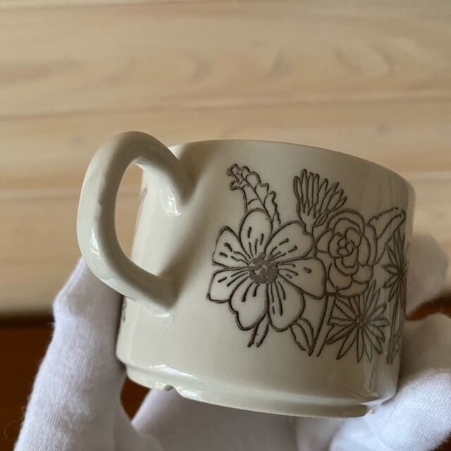 カップ内側底に極小突起・小さい突起・薄いペイントの付着・光にあてるとわかる薄い水垢跡があり、カップ持ち手に素地の凹みと素地の付着物があります。ソーサー表面に小さいペイントの付着と若干の小傷があり、ソーサー裏面に若干の汚れがありますが、艶がありヒビ・欠け・貫入の無い良いヴィンテージコンディションです。