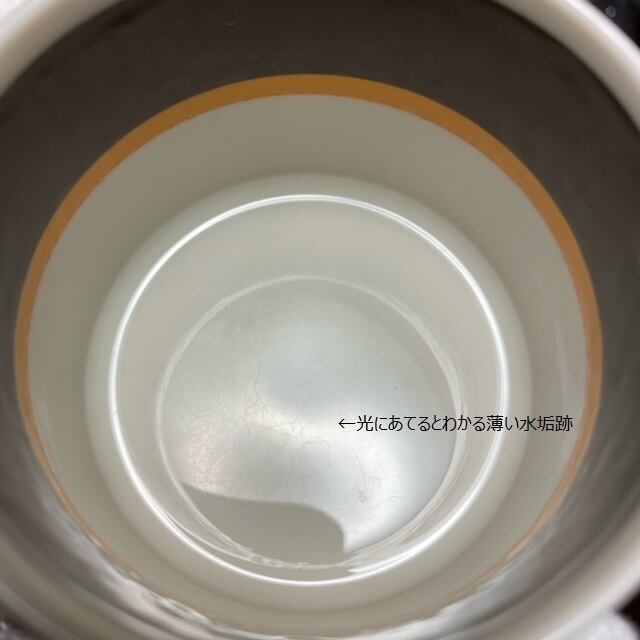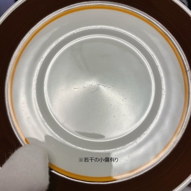 カップ内側底に光にあてるとわかる薄い水垢跡・カップ裏面高台に小さい汚れがあり、カップ内側側面のオレンジラインの一部分に素地とペイントのムラがあります。ソーサー表面に若干の小傷があり、ソーサー裏面高台に若干の汚れがありますが、艶がありヒビ・欠け・貫入の無い良いヴィンテージコンディションです。