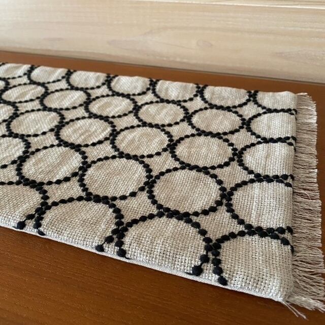 ミナペルホネンtambourine/タンバリン(ライトベージュ色にブラック色の刺繍)の生地で作ったマルチクロスです。