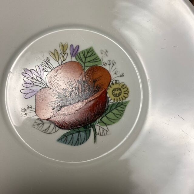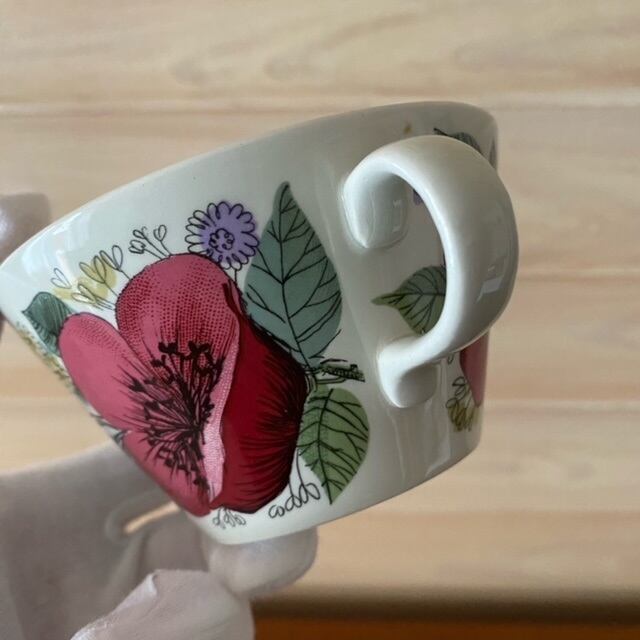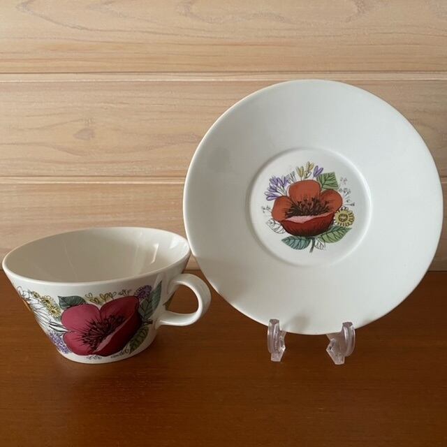 異なるタッチの花達が全面に描かれたカップと、カップ接地面にまで絵付けされたソーサーの組み合わせは、大変美しくデザイン性の高さがうかがえます。