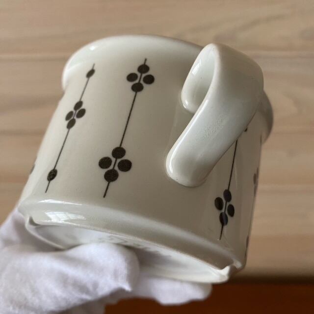 ファエンツァなどにも使われたベーシックフォルムに、黒い線・ドット・薄いブラウンのラインを描いたシンプルなデザインで、ドットを4つ並べた絵柄は木の実を連想させます。