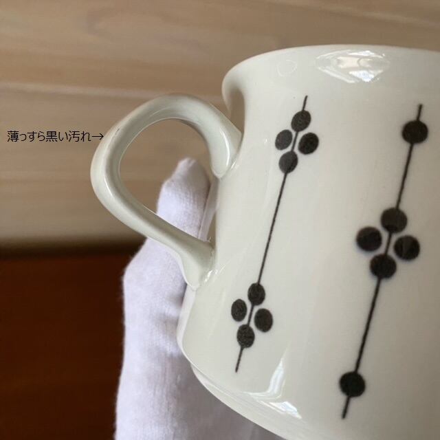 ソーサーの表面に若干の使用感・擦れ・小傷があり、ソーサー裏面縁に裏面からのみ見える約2.5㎜の欠けがあります。カップ持ち手に薄っすら黒い汚れ・カップ裏面高台に若干の汚れがあり、カップ内側底に貫入があります。ソーサー裏面欠けとカップ内側貫入を考慮した価格となっております。