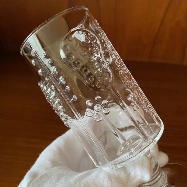脚の底面に製造時に出来たしわ・白いラインや気泡混入などがございますが、このシリーズによく発生するもので不良品ではございません。またグラス側面に、汚れの付着のような小さいざらつきがあります。