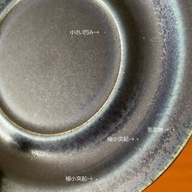ソーサー表面と裏面に気泡跡・極小突起・小さい凹みが数か所あり、ソーサーリブは若干の歪みがあります。