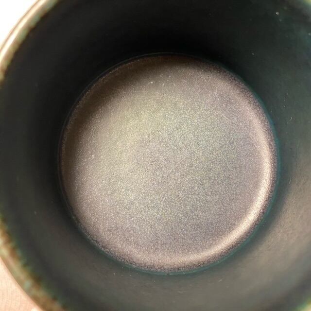 カップ側面持ち手付近に気泡跡、カップ側面下部にペイントの薄い箇所があり、カップ裏面に小さいペイントロス・気泡跡があります。
