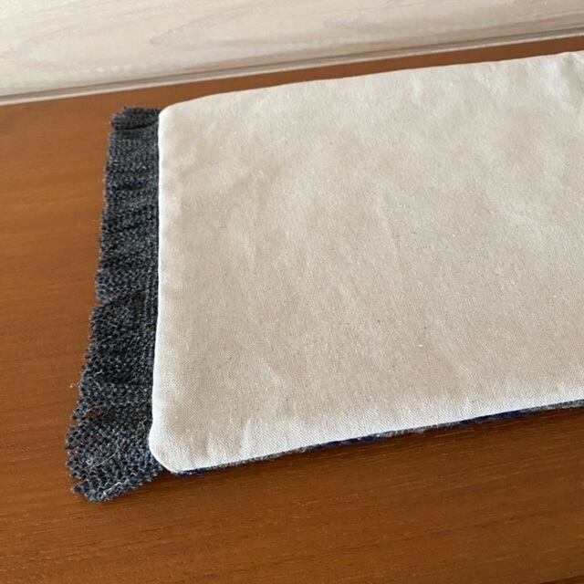 (外布)表面/ミナペルホネン tambourine(チャコールグレー生地にネイビー刺繍)リネン60%・ウール40%生地,裏面/綿麻生地(生成り)